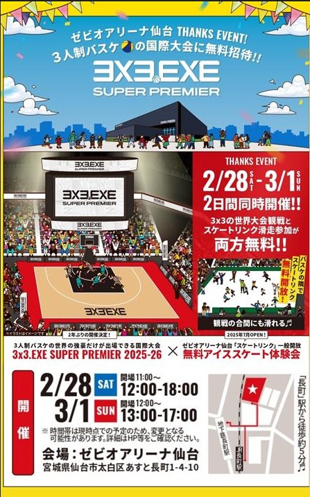 当日は、3人制バスケットボールの国際大会3×3.EXE SUPER PREMIERの観戦とアイススケートを同時に楽しめるイベントとなっております。